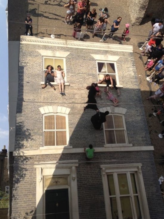 ótica através de espelhos, assim tinha-se a impressão que as pessoas estavam mesmo na fachada da casa. Divertido! Em uma versão,acima, eu e Gabi estamos lixando as unhas na janela, na outra peguei uma vassoura ali em algum canto para dar a impressão que estava voando. As demais pessoas estavam lá também se divertindo como nós.