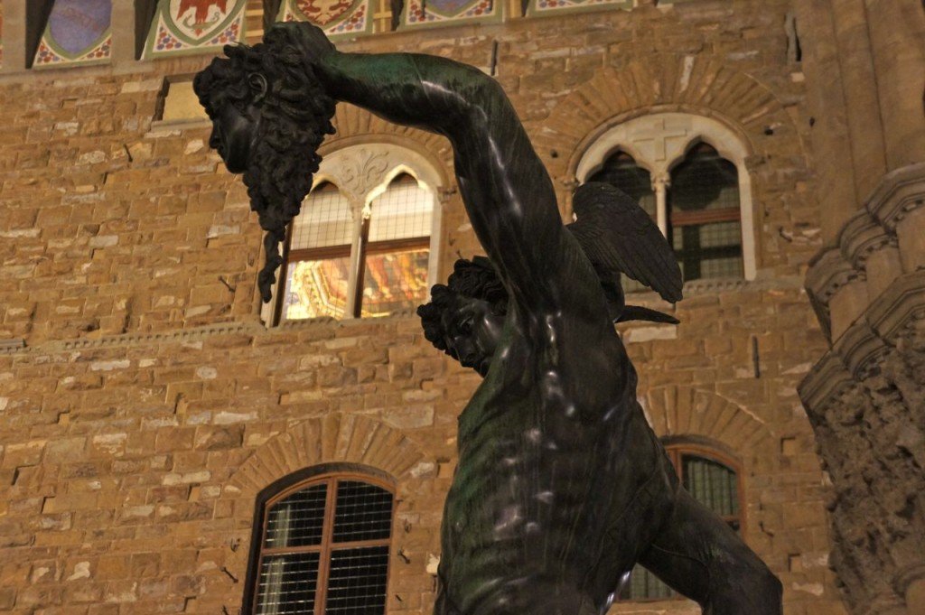 Outra maravilha é o Perseus de Benvenuto Cellini todo de bronze segurando a cabeça da Medusa. No fundo, os afrescos do Salone del Cinquecento dentro do Palazzo Vecchio.