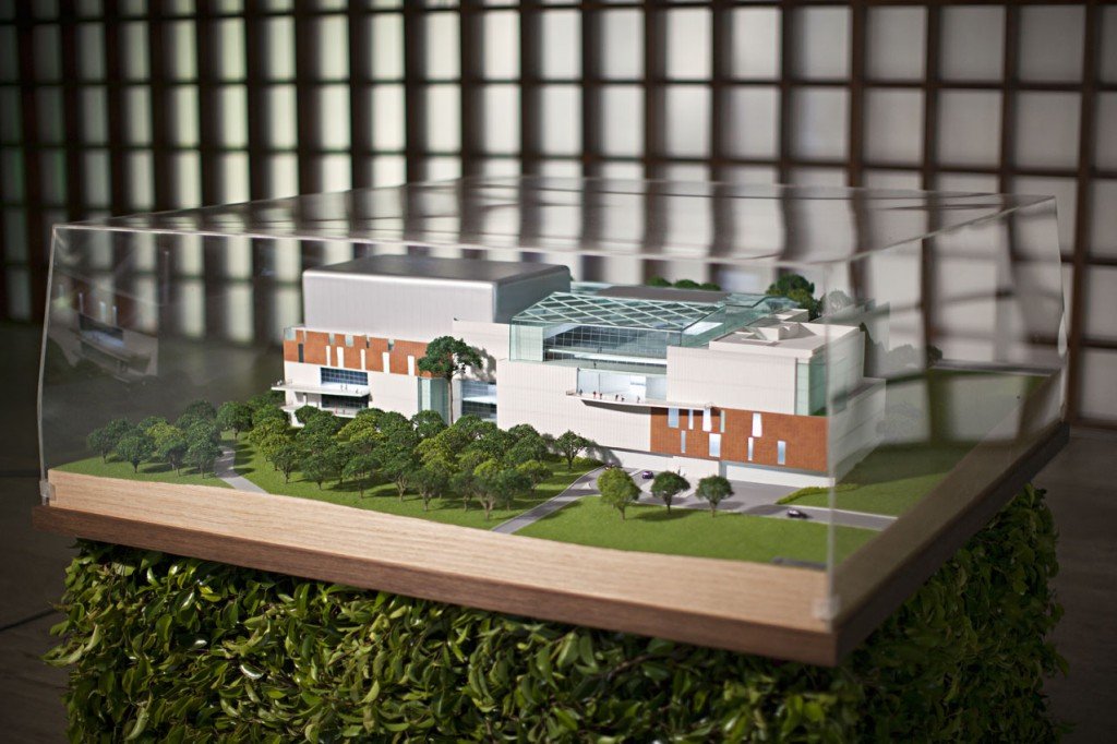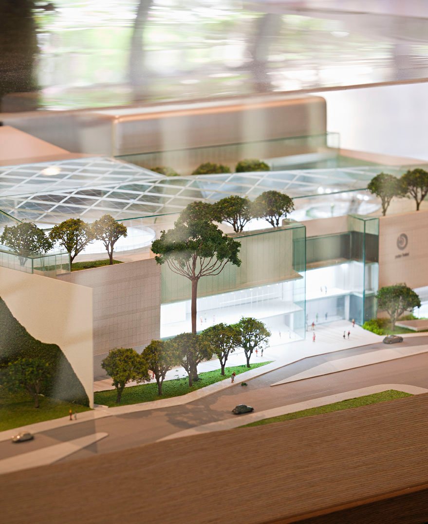 A maquete mostra a fachada de 130 metros, quase inteiramente de vidro, que faz transparecer já de fora, as lojas dentro. Também vemos o quarto andar quase totalmente coberto de vidro.