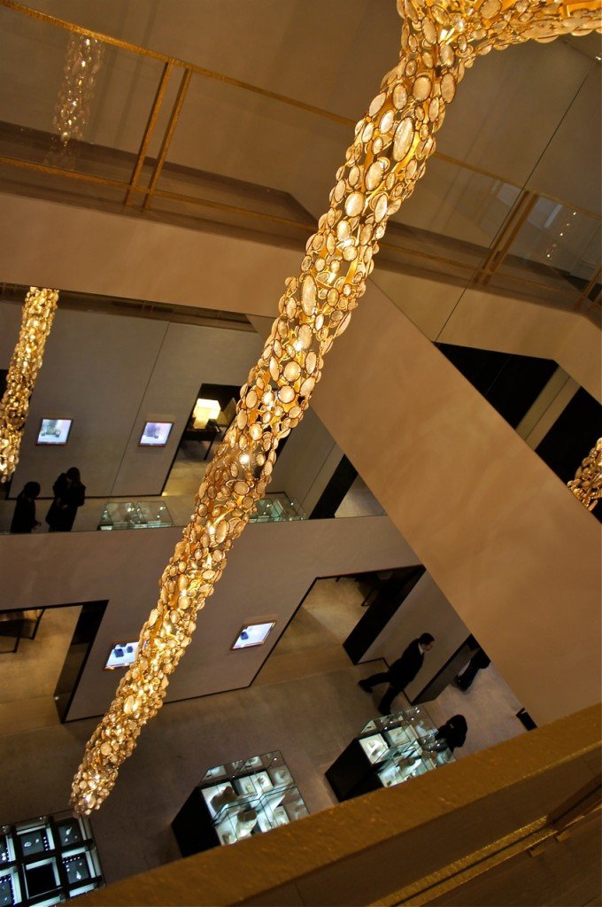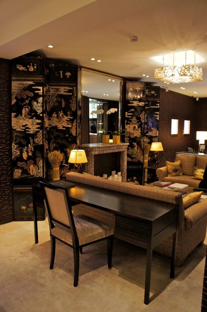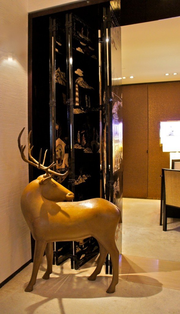 Vocês que agora, como eu,  conhecem o apartamento de Mademoiselle Coco Chanel (graças a ESTE post) vão logo reparar que a decoração da loja busca imitar os aposentos particulares da estilista icônica.  Coromandels (biombos chineses), detalhes de folhas de ouro, estátuas de veadinhos, espelhos dourados, orquídeas e móveis de design oriental lacados de preto trazem o espírito Chanel à loja.