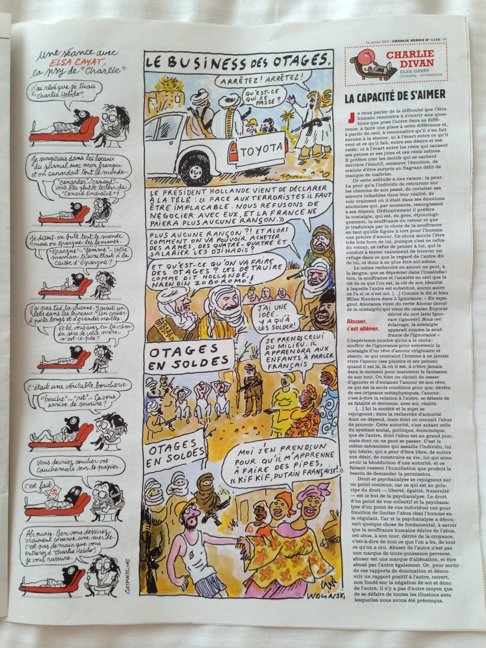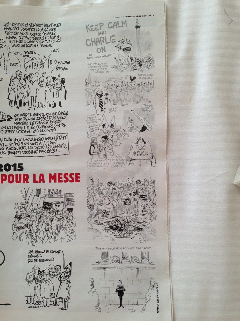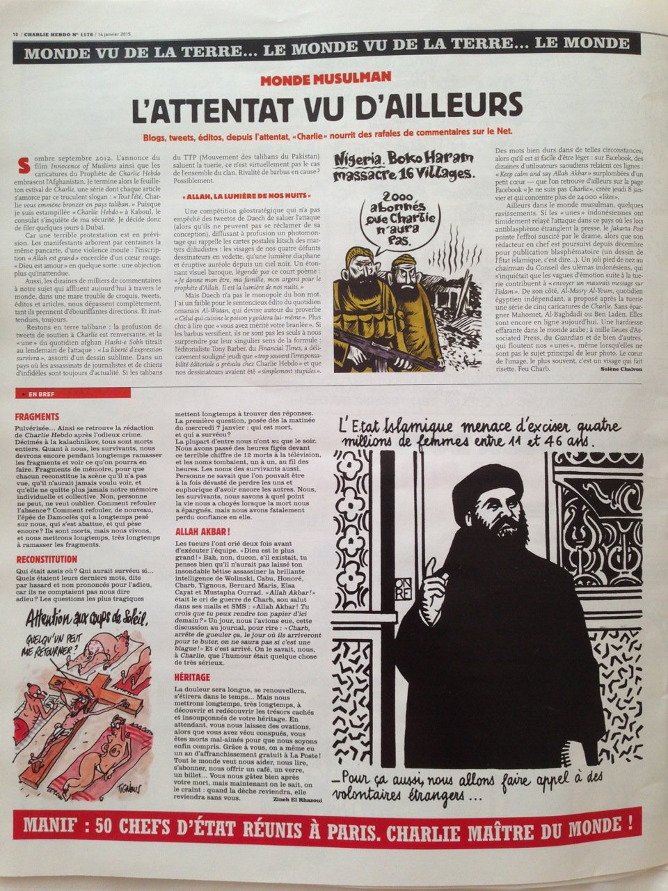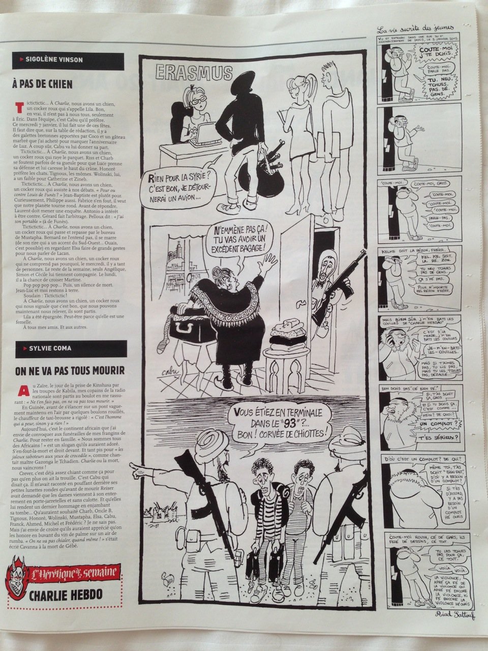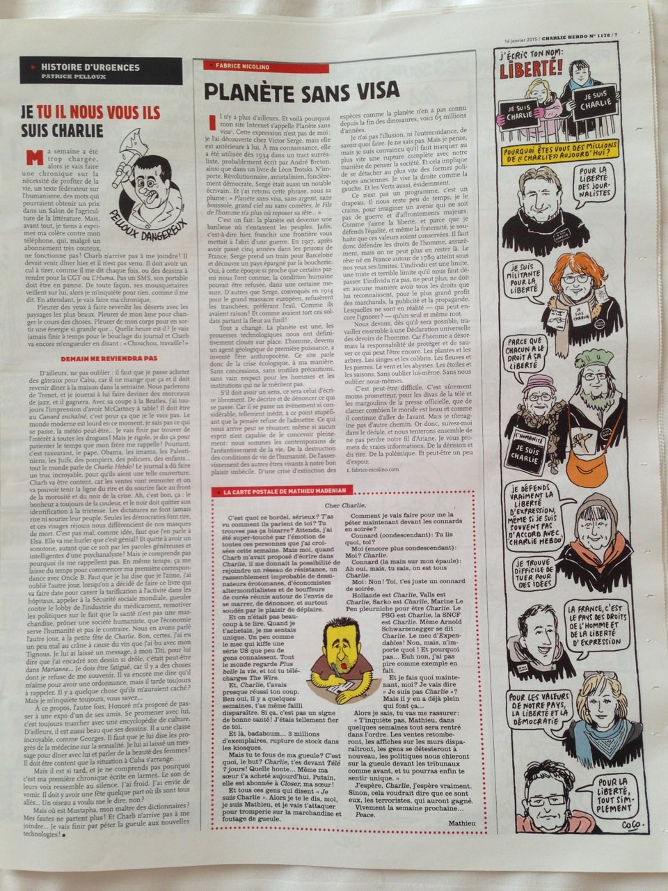 Dia 7 fui a Nova Iorque e parei em Paris. Fui à cidade e estava a poucos quilómetros de onde aconteceu o massacre da redação da Charlie Hebdo. Voltando ontem, foi o dia que saiu o primeiro exemplar depois do evento. Nas bancas ele estava esgotado e me surpreendi no lounge quando a nossa hostess distribuiu um a um o exemplar tão precioso.