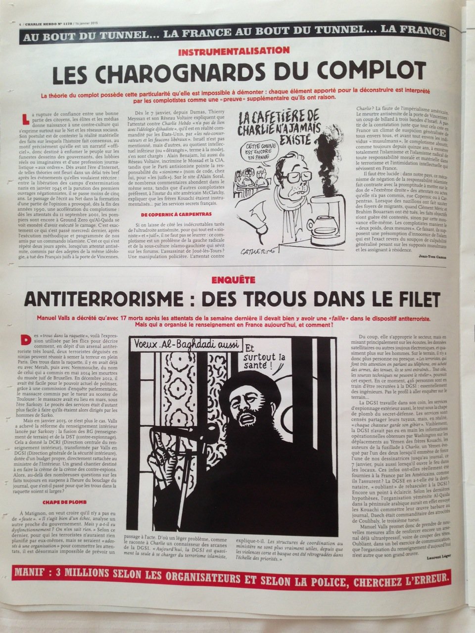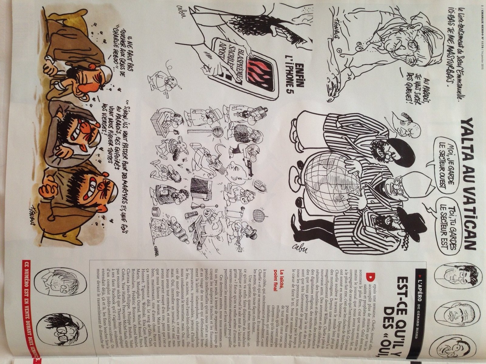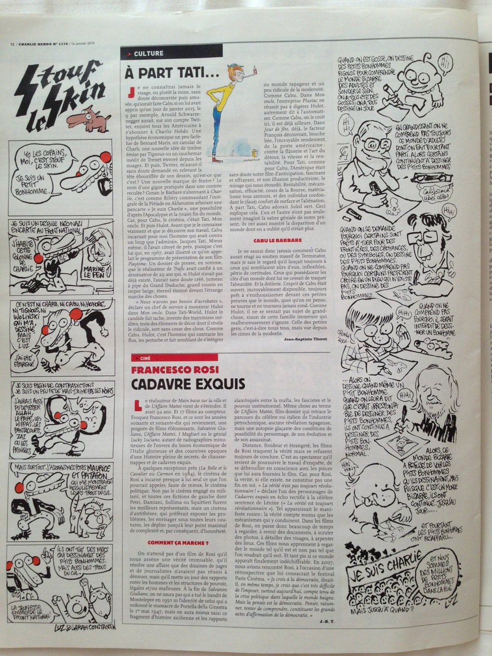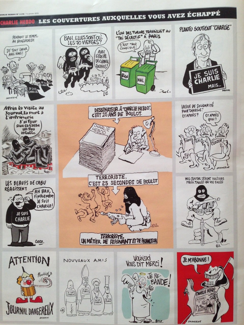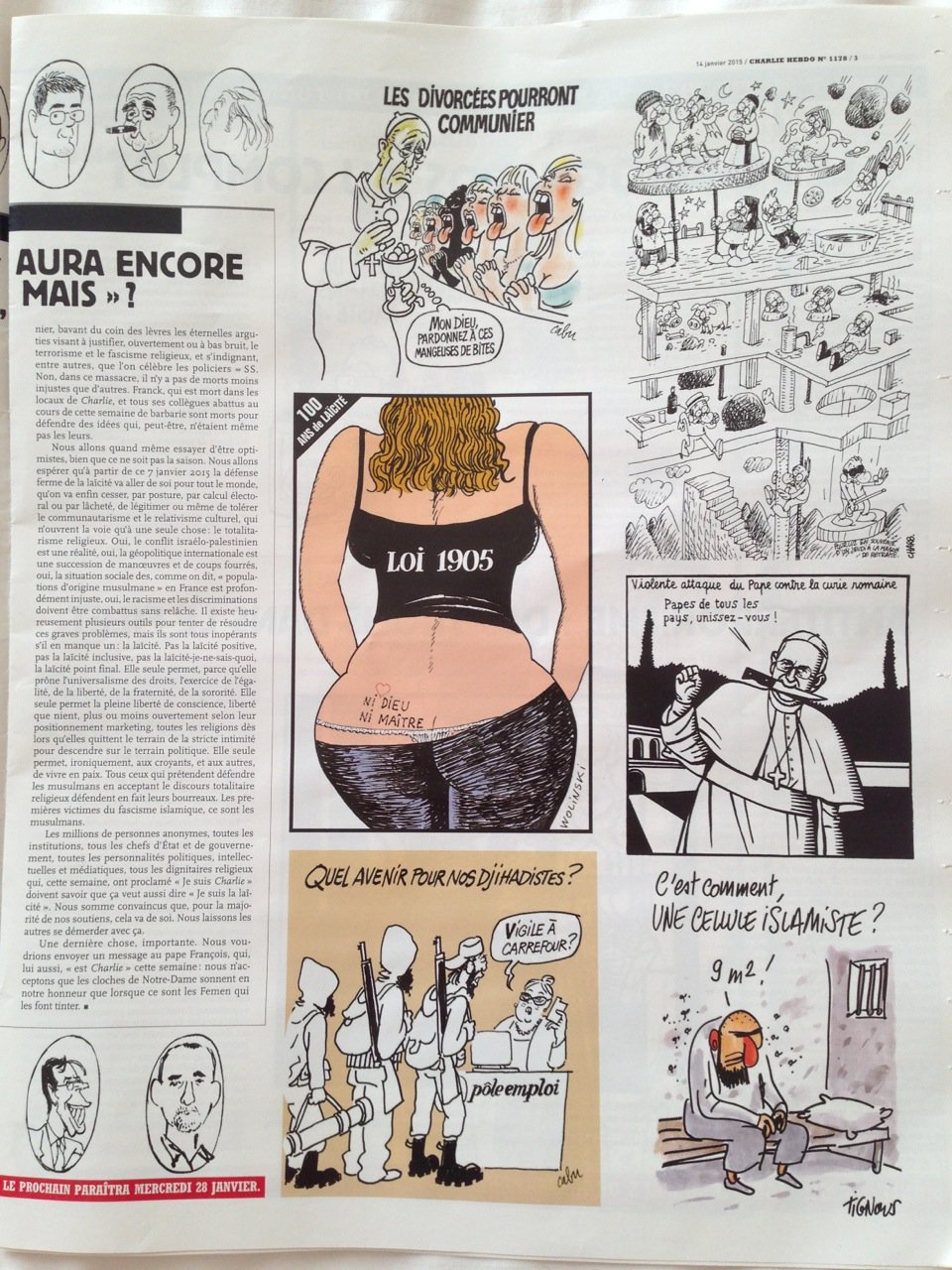 Dia 7 fui a Nova Iorque e parei em Paris. Fui à cidade e estava a poucos quilómetros de onde aconteceu o massacre da redação da Charlie Hebdo. Voltando ontem, foi o dia que saiu o primeiro exemplar depois do evento. Nas bancas ele estava esgotado e me surpreendi no lounge quando a nossa hostess distribuiu um a um o exemplar tão precioso.