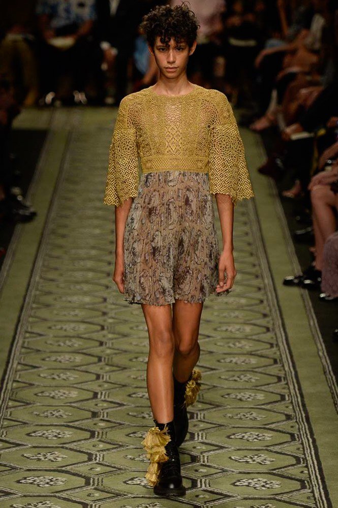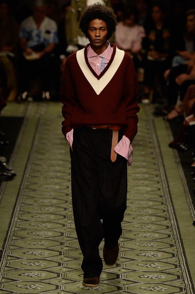 Com tudo isto, o desfile tinha que ser espetacular… e foi!!! Trazendo peças chave como o pijama, trench e casacos militares inspirados no livro de Virginia Woolf, Orlando (sobre cada assento estava uma cópia do livro). Nele o personagem principal passa de século em século aleatoriamente entre os sexos. E assim também foi a passarela da Burberry. As peças podem ser usadas tanto por homens quanto mulheres definidas apenas pelo styling, no melhor uso do genderless! Camadas de ricas texturas, golas-sanfona elizabetanas e volumes, carregados com grande desenvoltura, podem ser despidas para o verão.