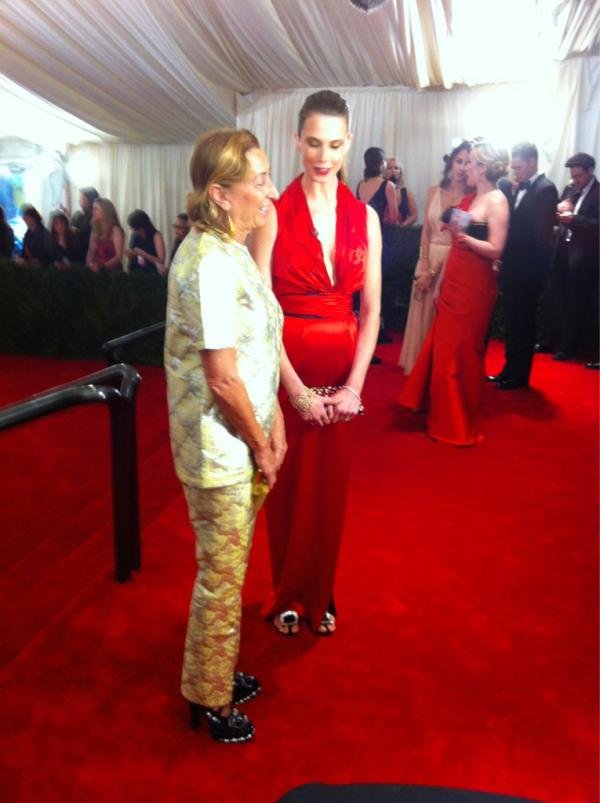 Porém, até o último minuto não se sabia se a própria Miuccia estaria presente pois havia caido, literalmente, do salto!! Ela torceu o pé capotando da plataforma de seu sapato e ficou de molho! Mas na última hora, chegou!! Esta foi a única foto que encontrei dela no twitter do Metropolitan Museum.