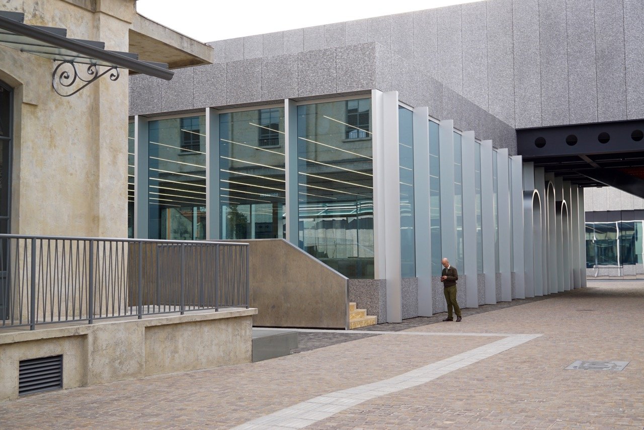 O espaço é intrigante. Koolhaas (post sobre ele AQUI) gosta de manter o original e adicionar a ele. Neste caso sua intervenção foi potente com materiais inesperados, industriais e de contraste. No interior resina e aço; no exterior alumínio, cimento, pedra, madeira e ouro!