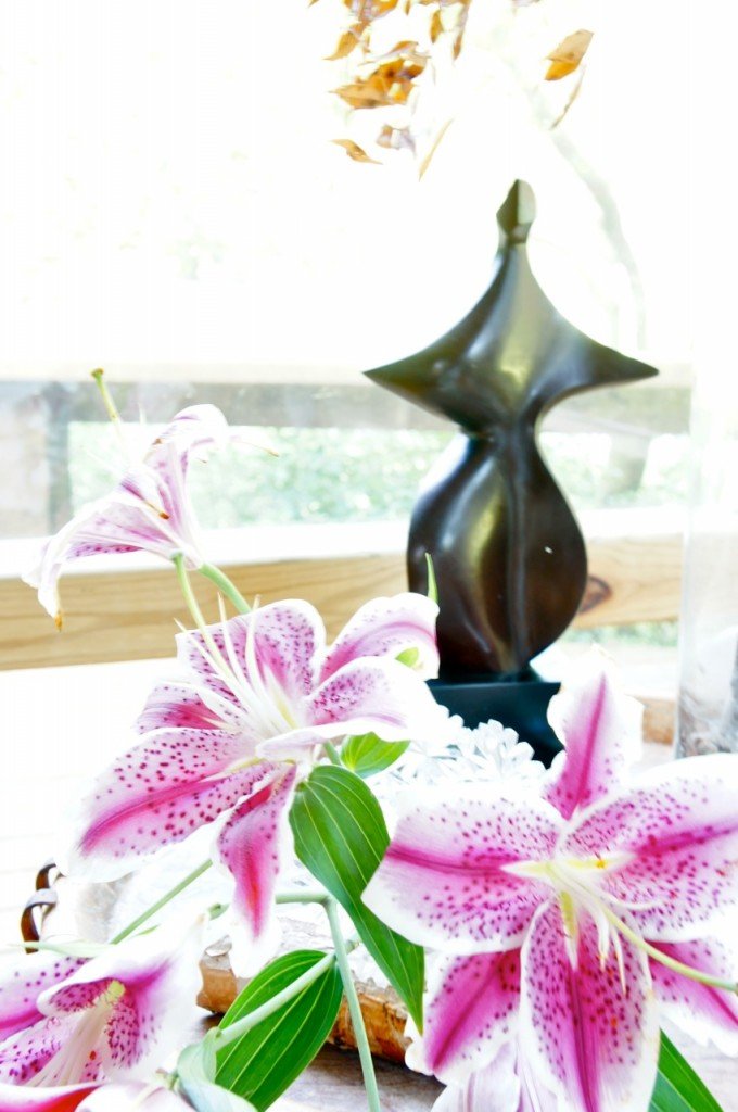 Este lindo canto da sala no ranch, meu pai sempre decora com lírios. Lembro desta estátua desde pequena. É uma jovem dançando e se chama "15 anos". Sempre adorei...