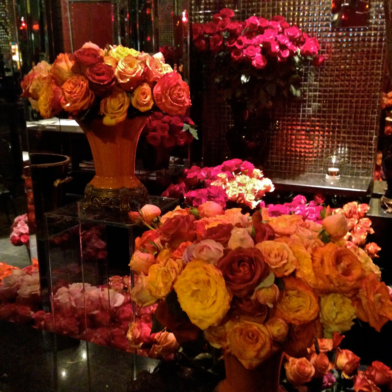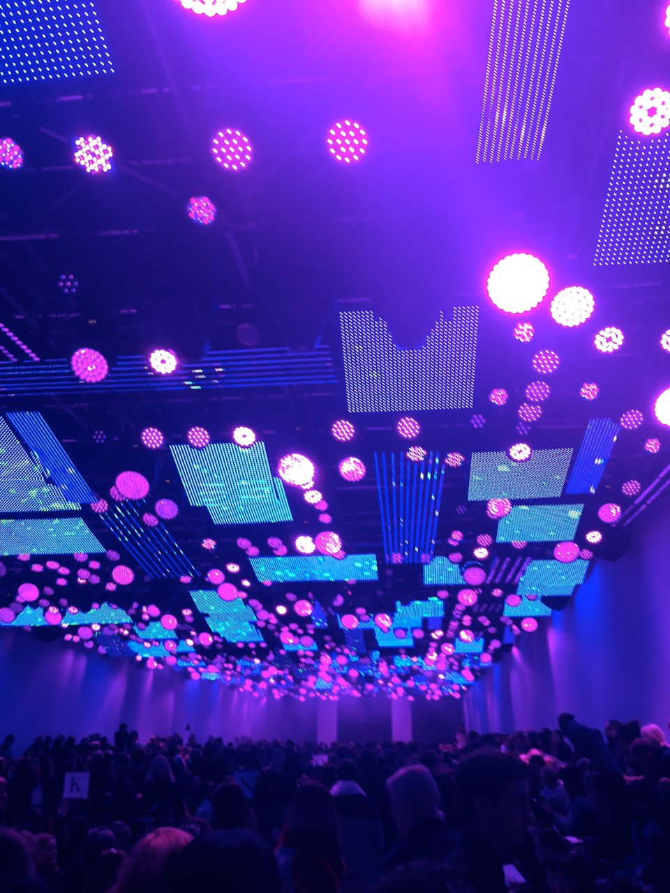 Dentro, a decoração era toda de holofotes que mudavam de cor e durante o desfile se transformaram em flores…