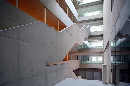 A sede, imponente, talvez um pouco pesada, encontra equilíbrio em grandes espaços abertos onde alunos e professores podem se relacionar como também enormes janelas por onde o espaço acadêmico se relaciona com a cidade movimentada que é Milão.