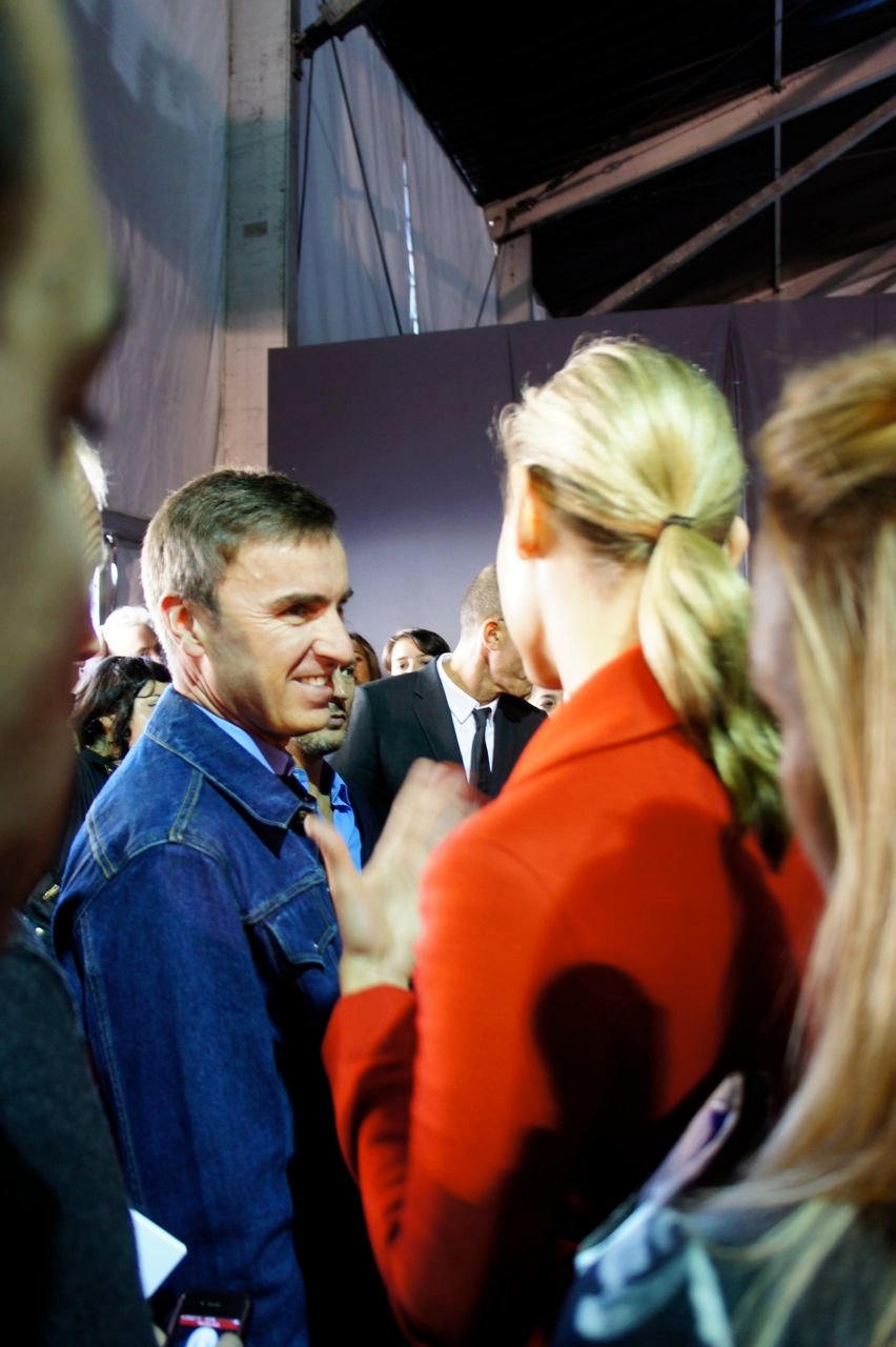 E é aqui que Leelee Sobiesky dá seus parabéns a Raf Simons pelo seu primeiro show da Dior. Dizem que a noite antes ela foi o visitar no showroom usando a jaqueta de jeans que ele está usando. Ele gostou e ela a deu de presente como amuleto de boa sorte.