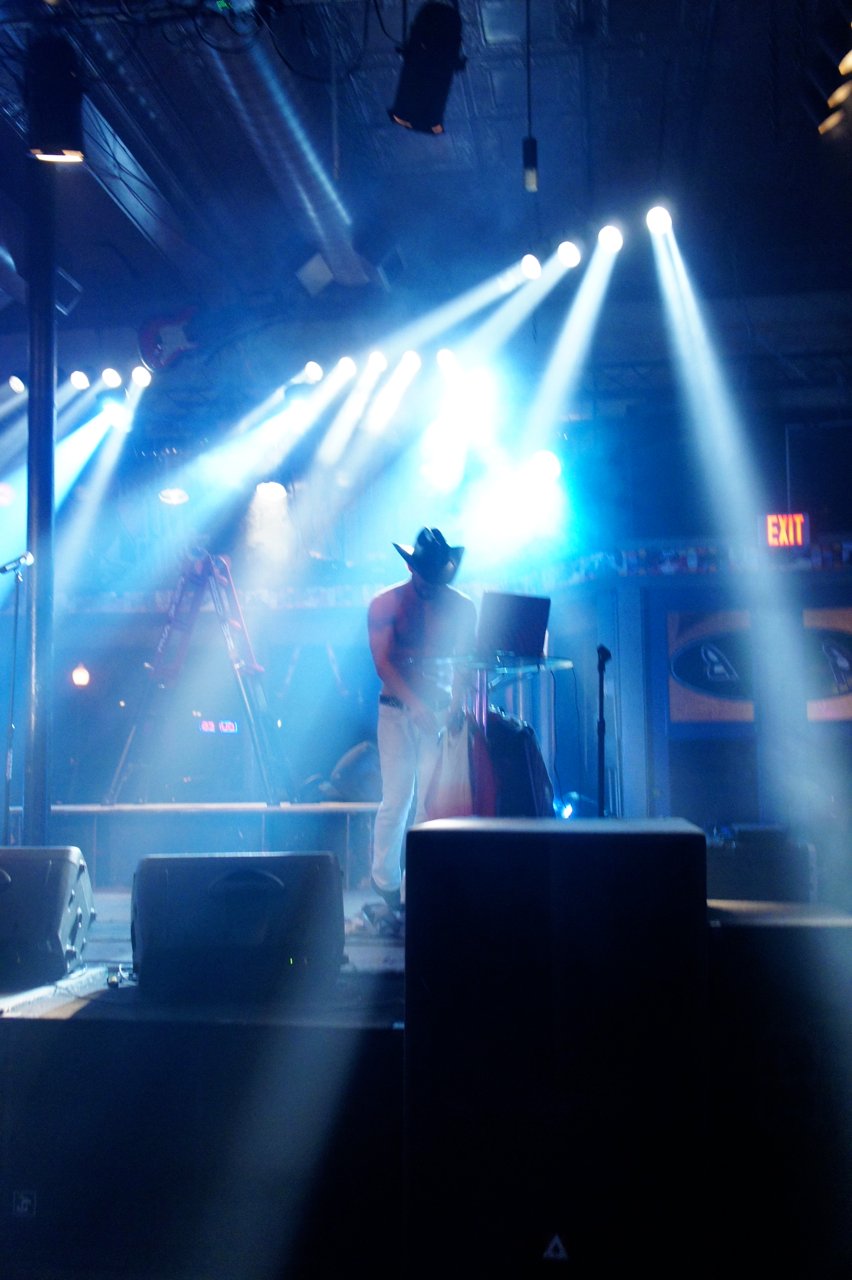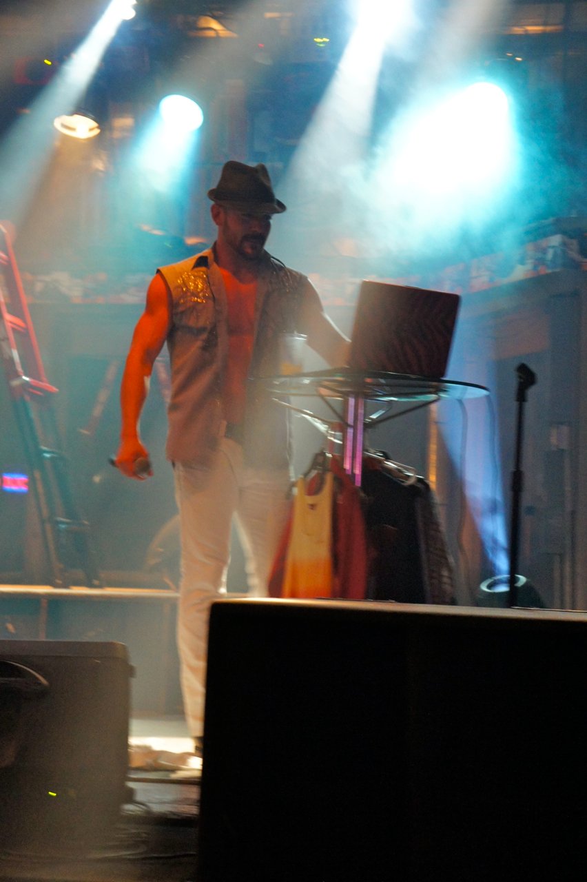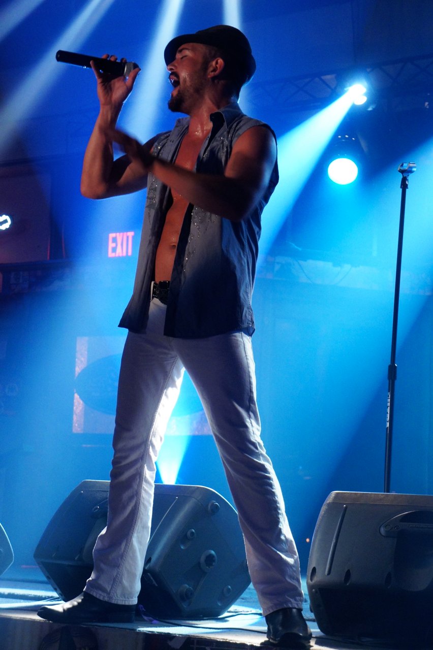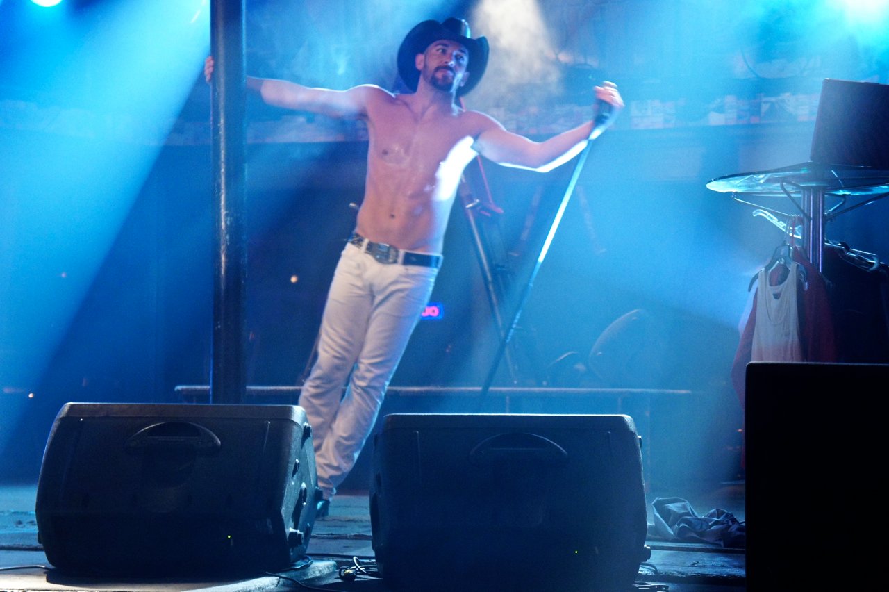 Neste sábado foi a vez de Chase Brown! Foi hilário!! Difícil definí-lo. Acho que teria que dizer que é um tipo de cantor-cowboy-light-porn. Um one-man-show onde Chase canta muito bem acompanhado pelo computador. Mas não termina aí, a coisa incrível é que entre uma canção e a outra ele para para escolher a próxima perdendo a animação que começara na canção anterior onde ele se esgoelou para nos envolver!! Mas ainda não termina aí!!! Entre uma canção e a outra ele faz troca de figurino no palco mesmo escolhendo entre camisas apertadas ou torço nu!! Tem até ventilador para efeito especial… E o que dizer da troca de chapéu!?!?!!! Amazing!! Maravilhoso!!! Já falei, não é? Este é um país surreal!!