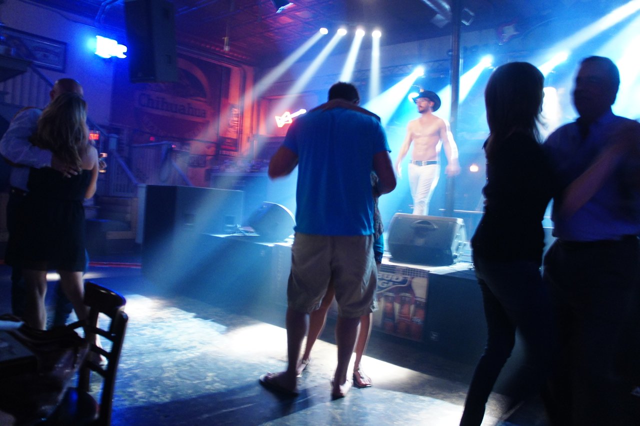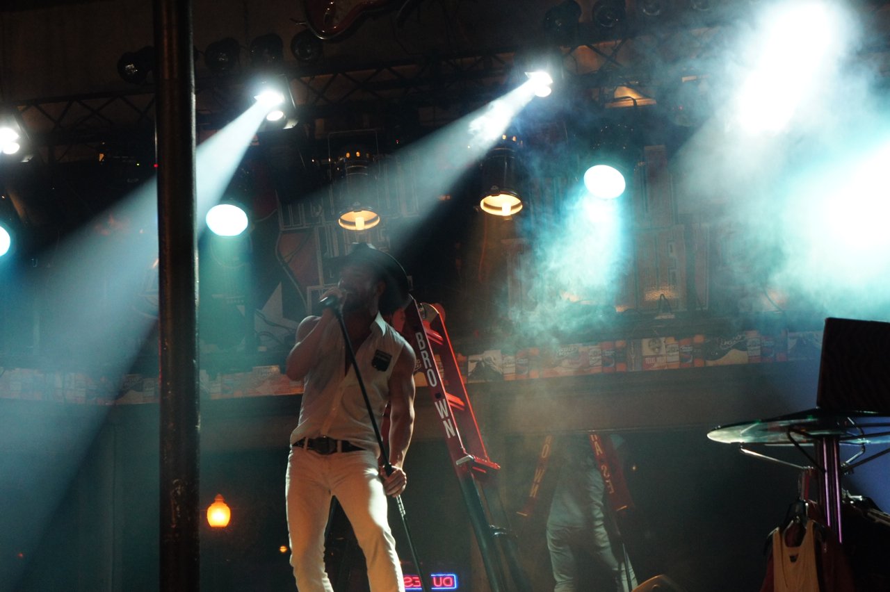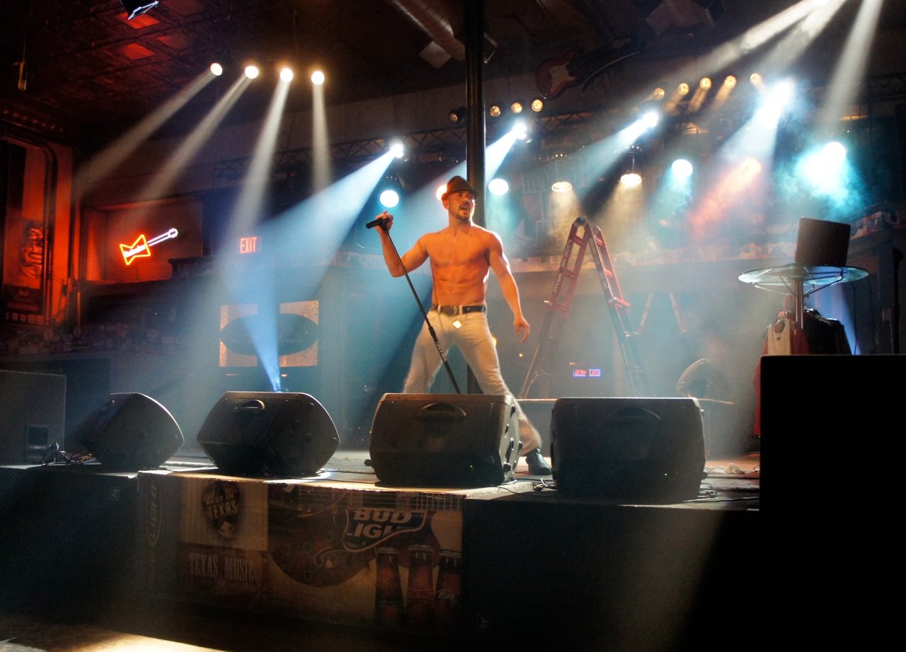 Neste sábado foi a vez de Chase Brown! Foi hilário!! Difícil definí-lo. Acho que teria que dizer que é um tipo de cantor-cowboy-light-porn. Um one-man-show onde Chase canta muito bem acompanhado pelo computador. Mas não termina aí, a coisa incrível é que entre uma canção e a outra ele para para escolher a próxima perdendo a animação que começara na canção anterior onde ele se esgoelou para nos envolver!! Mas ainda não termina aí!!! Entre uma canção e a outra ele faz troca de figurino no palco mesmo escolhendo entre camisas apertadas ou torço nu!! Tem até ventilador para efeito especial… E o que dizer da troca de chapéu!?!?!!! Amazing!! Maravilhoso!!! Já falei, não é? Este é um país surreal!!